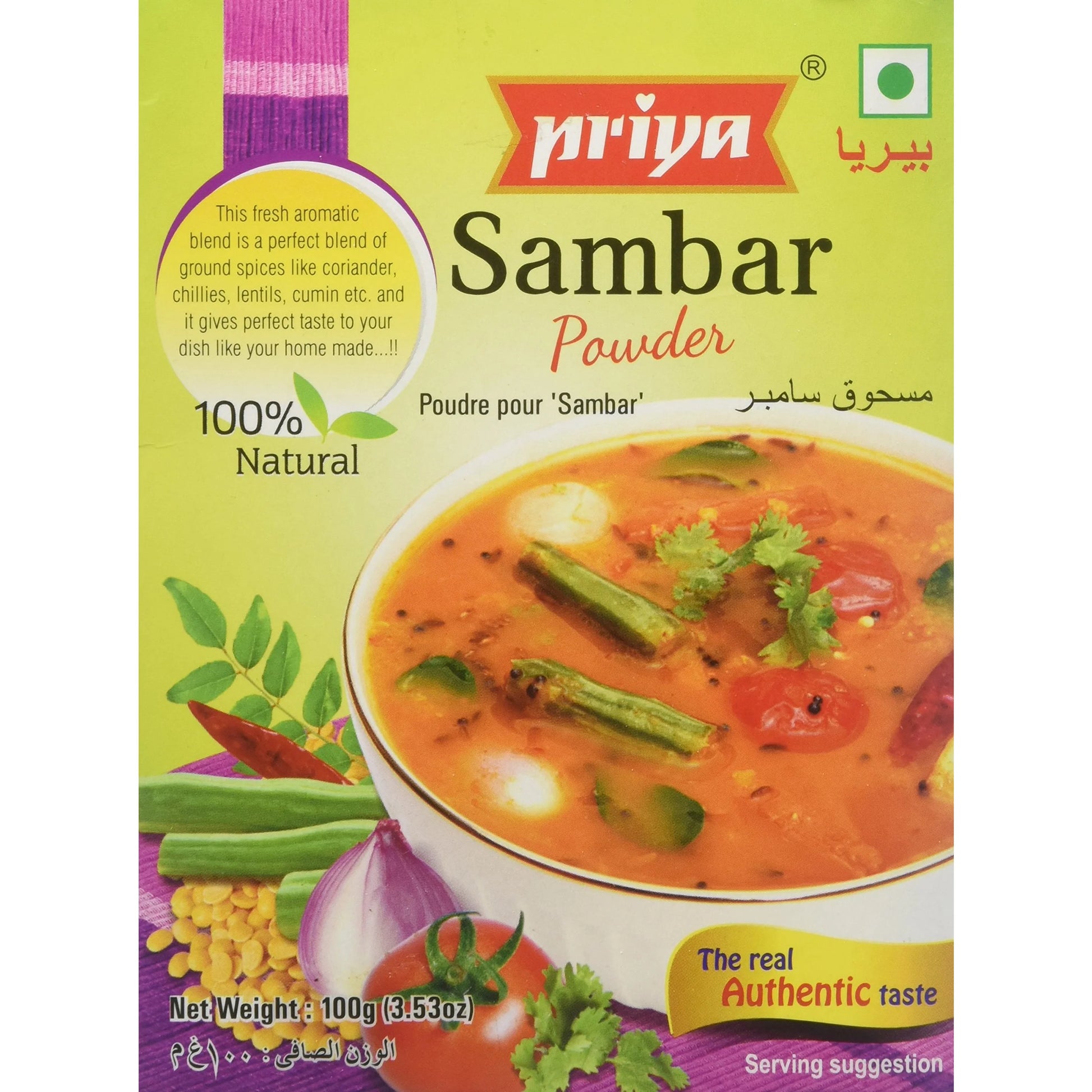 Priya Sambar Powder is an authentic, rich and aromatic blend of spices from South India, which is ideal for preparing the traditional dish - sambar. Sambar is a tasty and spicy dish of lentils and vegetables, which is one of the most popular dishes of South Indian cuisine. Priya Powder contains carefully selected ingredients such as dried cumin, turmeric, black pepper, dried tamarind and many others, which give sambar its characteristic, deep and bold flavour. Each 100g pack is a convenient way to easily add the true, traditional taste of sambar to your dishes. Simply add it to cooked lentils or vegetables and you will have a tasty and authentic dish of South Indian cuisine. Priya Sambar Powder is a great product that will allow you to enjoy the rich flavours of India in the comfort of your kitchen.