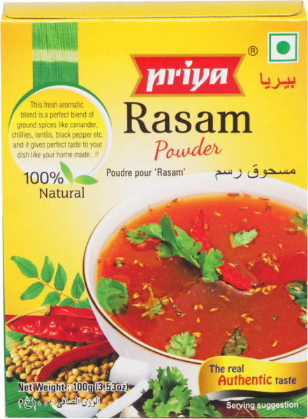 Priya Rasam Powder is a traditional Indian spice blend that adds a unique flavor and aroma to meat, fish, and legume dishes. Rasam is a soup made from water, tomatoes, tamarind, and a blend of aromatic spices. This powder contains carefully selected ingredients such as salt, pepper, curry, coriander, black cumin, garlic, and ginger, which add depth and complexity to dishes. Rasam is an extremely popular dish in South Indian cuisine, and Priya Rasam Powder makes it easy and quick to make this delicious soup at home. Simply dissolve the powder in hot water to enjoy the perfectly balanced, slightly spicy and sour taste of rasam. The product is completely vegetarian and vegan, making it a great choice for those who prefer a plant-based diet. Priya Rasam Powder is a convenient way to discover the authentic flavors of Indian cuisine in the comfort of your own home.