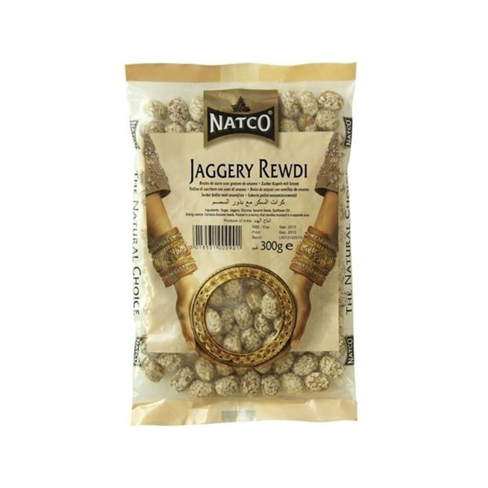Jaggery Rewdi is a traditional Indian sweet that is gaining popularity all over the world. It is made from unrefined, brown cane sugar, called jaggery. Jaggery Rewdi Natco is a version of this sweet snack that has been packed in a convenient 300-gram package.